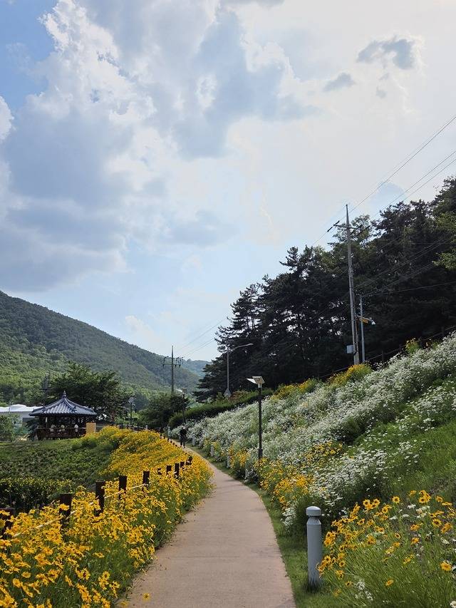 샤스타데이지는 하얀 꽃잎에 노란 중심부를 가진 국화과의 식물로, 보기만 해도 마음이 환해지는 시원한 색감 덕분에 '희망'과 '순수함'을 상징한다. 진밭골 산림공원 내 산책로와 수변 데크를 따라 줄지어 피어난 샤스타데이지는 큰금계국과 함께 초여름 햇살 아래 장관을 이루고 있다.