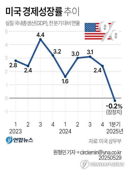 (서울=연합뉴스) 원형민 기자 = 미 상무부는 1분기 미국의 국내총생산(GDP) 증감률(잠정치)이 -0.2%(직전분기 대비 연율)로 집계됐다고 29일(현지시간) 밝혔다.