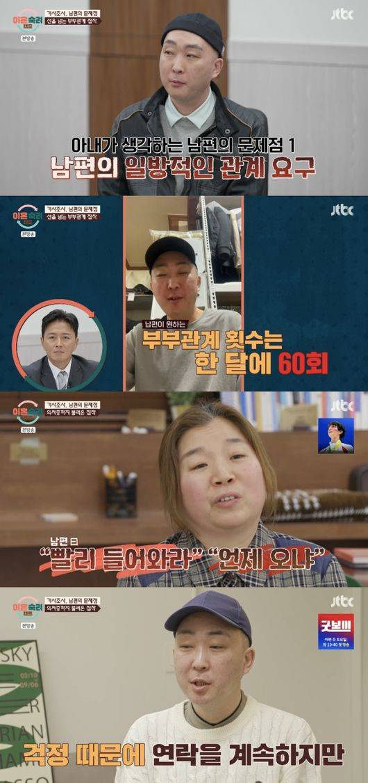 제작진과의 인터뷰에서 남편은 “부부관계 아예 안 받아주냐”는 물음에 “한 달에 10번은 받아준다. 저는 그게 만족이 안 되니까. 한 달에 60회 원한다”라고 밝혀 모두를 놀라게 했다. 깜짝 놀란 박하선은 “마흔넷에 (한달에) 60번 원하시는거 20대도 힘든데”라고 당황해했고, 진태현도 “진심으로 하시는 말이냐”라고 반응했다.