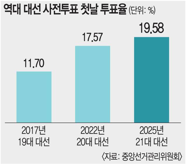 중앙선거관리위원회는 첫날 사전투표에서 전체 유권자 4439만1871명 중 869만1711명이 투표를 완료해 투표율 19.58%를 기록했다고 밝혔다. 사전투표 제도가 전국 단위 선거에 도입된 2014년 6월 지방선거 이후 전국 단위 선거 첫날 투표율 중에서는 가장 높다. 박상병 인하대 초빙교수는 “평일인데도 사전투표율이 높다는 건 이번 대선 전체 투표율도 높을 가능성이 크다는 의미”라며 “일반적으로 투표율이 높으면 정권심판론이 힘을 받는다”고 말했다.