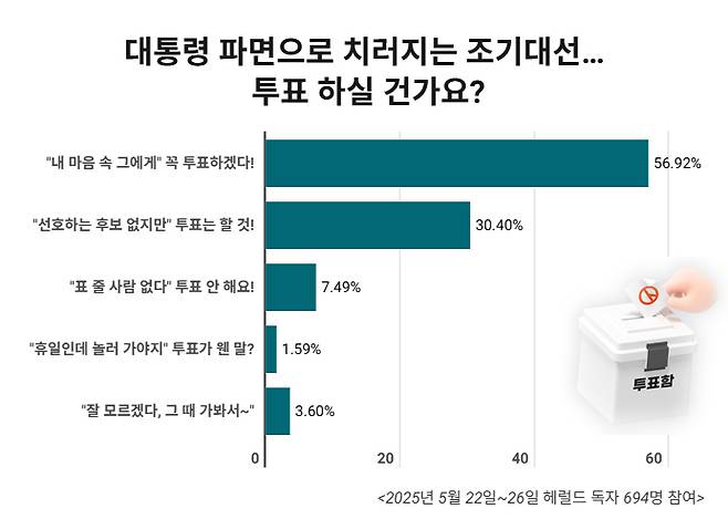 헤럴드경제가 지난 22일부터 26일까지 홈페이지를 방문한 독자들을 대상으로 설문조사를 진행한 결과, 전체 응답자 694명 가운데 절반이 넘는 56.92%(395명)가 ‘마음 속에 정해놓은 후보에게 반드시 투표하겠다’고 답했습니다.