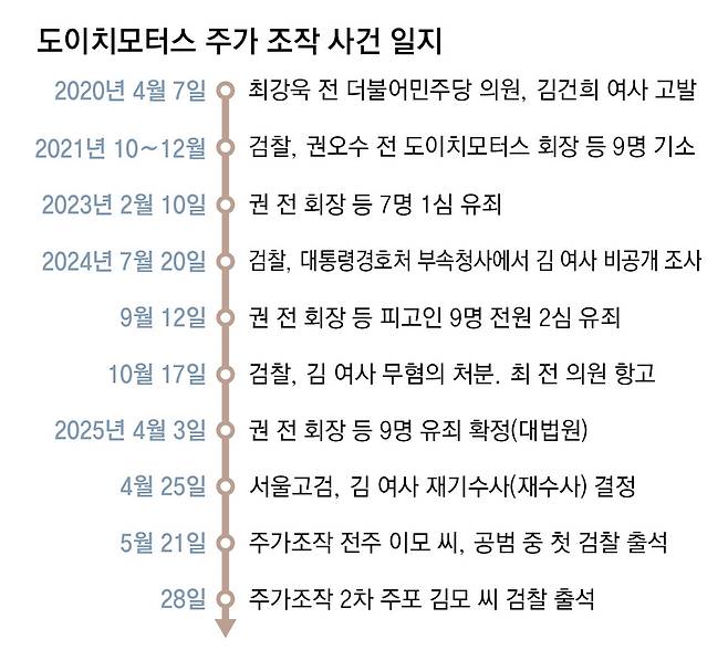 특히 윤 전 대통령 파면과 관련자들의 유죄 확정 판결 이후 주가조작 가담자들의 진술도 일부 달라진 것으로 알려졌다. 검찰은 김 여사와 모친 최은순 씨의 수익 규모를 23억 원으로 적시한 자료를 법원에 제출했지만, 지난해 10월 수사 결과를 발표하면서 정확한 산정은 어렵다고 밝혔다. 수사 대상 이외의 수익까지 포함한 전체 수익을 추산하지 않았다는 취지다.