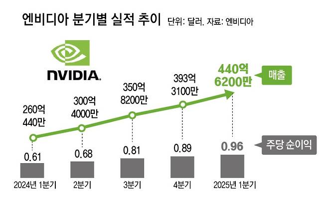 엔비디아는 2분기(5∼7월)에도 매출 450억 달러로 성장세를 이어갈 것으로 내다봤다. 기존 증권가 컨센서스(455억∼459억 달러)와 비슷한 수준이다. 중국 시장 수출이 막혔지만 다른 지역에서 고부가가치 제품인 블랙웰 시리즈 수요가 많기 때문이다.