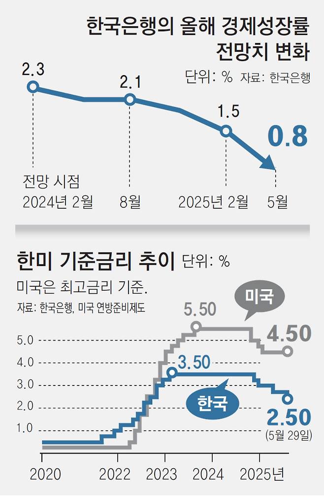 한은은 29일 발표한 경제전망에서 올해 한국 경제성장률을 0.8%로 낮춰 잡았다. 올 2월 전망치보다 0.7%포인트 낮다. 한은은 건설 경기 침체가 더욱 깊어졌고 민간소비 회복세도 예상보다 더딘 가운데 미국의 관세 정책까지 당초 전망보다 강도가 더 세졌기 때문이라고 설명했다. 한은은 무역 협상이 원만하게 진행돼 미국의 관세율이 상당 폭 인하되더라도 올해 경제성장률은 0.9%에 그치며 1%를 넘지 못할 것으로 봤다.