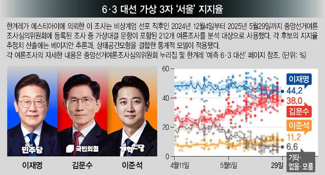 선거가 다가오면서 양쪽 유권자 진영이 단단히 결집한 흐름은 여론조사 추세로도 읽힌다. 한겨레가 여론조사 전문기관 에스티아이(STI)에 의뢰해 지난해 12월4일부터 5월29일까지 중앙선거여론조사심의위원회에 등록된 212개 여론조사를 분석한 대선 지지율 예측조사(여론조사 메타분석) 결과를 보면, 29일을 기준으로 서울 지역의 이재명 후보 지지율은 44.2%, 김문수 후보 38%, 이준석 후보 11.2%였다. 지난달 21일 28.2%포인트까지 벌어졌던 이재명 후보와 김문수 후보의 격차는 한자릿수(6.2%포인트)까지 좁혀진 상태다. 전국 7개 권역 중 부산·울산·경남(3.7%포인트), 강원·제주(5.5%포인트) 다음으로 격차가 적다.