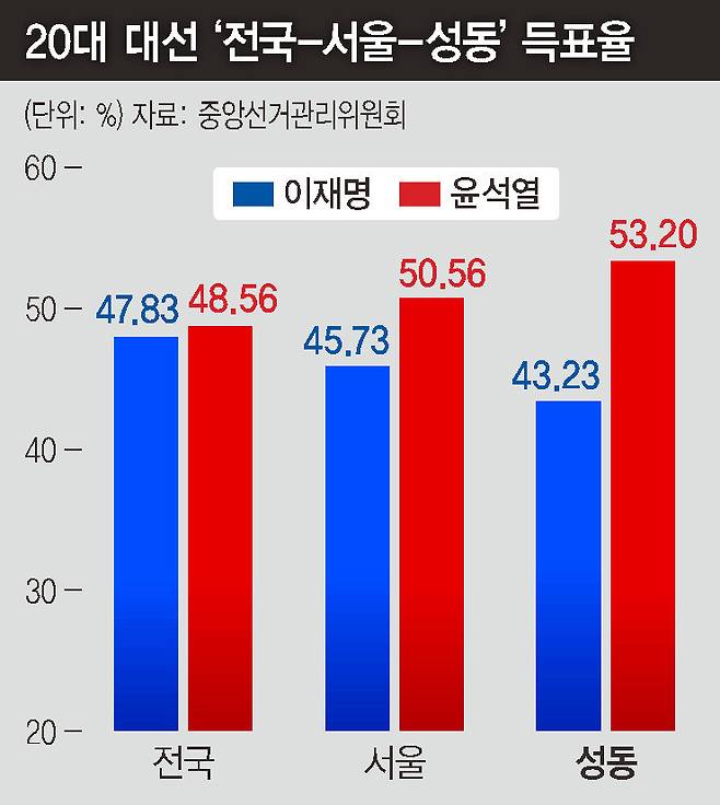 성동구는 수도권 최대 격전지로 꼽히는 ‘한강 벨트’(마포·용산·성동·광진·동작)에 속한다. 교통 요지인 왕십리역이 있고, 개발이 더딘 구도심(마장·용답 등)과 부동산값 상승세가 가팔랐던 신도심(금호·옥수 등), 신흥 번화가로 젠트리피케이션이 심화되는 성수동, 젊은층이 밀집한 대학가(한양대 주변) 등이 섞여 있어 ‘서울 민심의 바로미터’로 불린다.