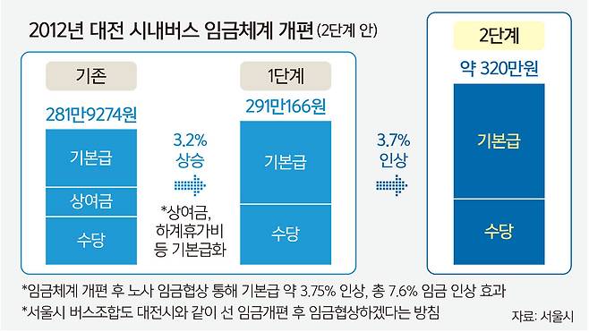 서울 시내버스 노사의 협상이 교착 상태에 빠진 가운데 서울시는 상여금 등 수당을 폐지하고 기본급을 인상하는 방향의 임금체계 개편을 검토하고 있다. 서울시는 이 같은 방식의 대전시 사례를 언급하며 시내버스 노조를 향해 “일단 (노사가) 대화를 시작하고, 재정 부담 문제는 그 다음 단계에서 논의해야 한다”고 촉구했다.
