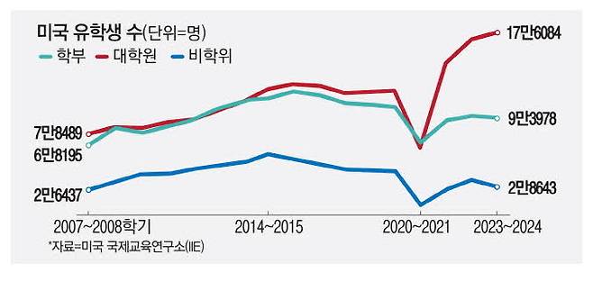 미국 국제교육연구소(IIE)에 따르면 2023~2024학년 미국 대학에서 유학 중인 외국인 가운데 중국 출신 비중이 25%다. 이는 인도(29%)에 이어 두 번째다. 전체 중국인 유학생 중 기술 혁신에 필수인 과학·기술·공학·수학(STEM) 분야를 전공하는 학생이 51.9%로 절반을 넘는다.