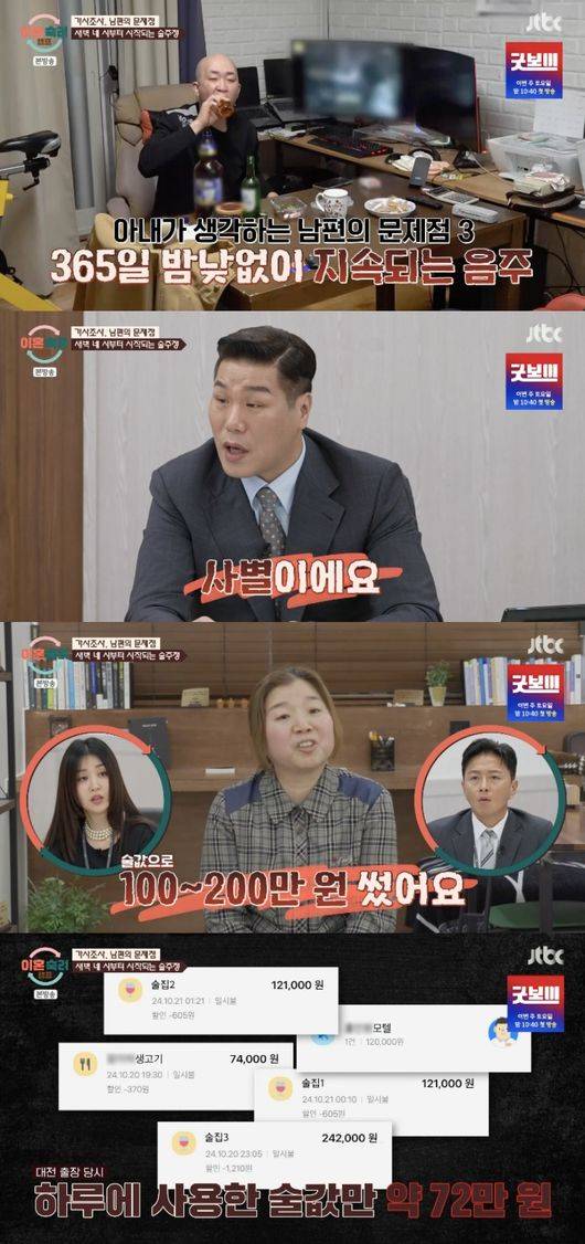 이날 아내는 남편의 문제점으로 일방적인 관계 요구, 과도한 집착, 술 등을 언급했다. 특히 남편은 하루종일 술로 시작해 술로 끝나는 일상을 공개해 모두를 놀라게 했다.