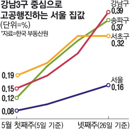 서초구(0.32%)와 송파구(0.37%)도 이번주 아파트값 상승률이 0.3%대를 넘어섰다. 서초는 반포·서초동 위주로, 송파구는 잠실·신천동 위주로 각각 상승 거래가 포착됐다. 강남3구와 함께 토지거래허가구역으로 묶여 있는 용산구(0.22%)도 집값이 뛰고 있다. 권대중 서강대 일반대학원 부동산학과 교수는 “지난 3월 토지거래허가구역 확대 지정에 잠시 숨을 고르던 강남3구 아파트 가격이 다시 움직이는 상황”이라고 밝혔다.