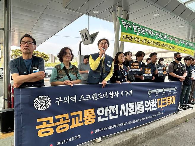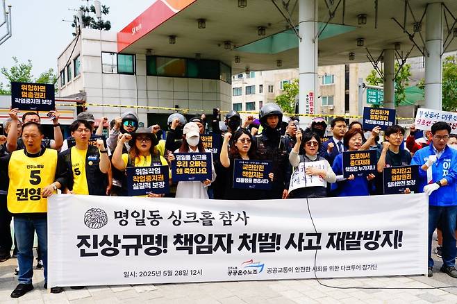 | ▲ 지난 28일 '구의역 스크린도어 사고 9주기-공공교통이 안전한 사회를 위한 다크투어' 중 서울 굽은다리역 인근 명일동에서 열린 '명일동 싱크홀 사고 진상규명! 책임자 처벌! 재발방지 대책요구 기자회견' 모습 |