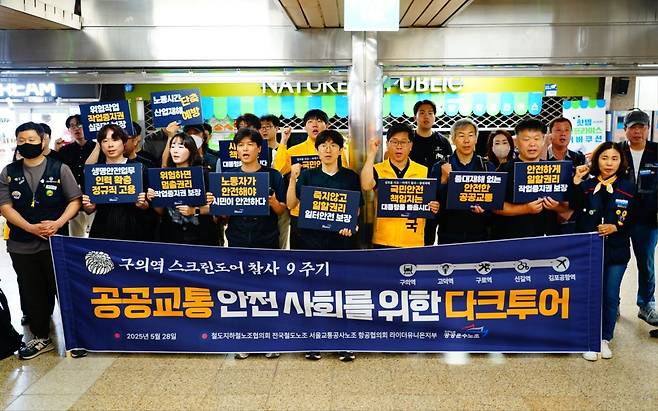 | ▲ 지난 28일 '구의역 스크린도어 사고 9주기-공공교통이 안전한 사회를 위한 다크투어' 중 김포공항에서 열린 무안공항 제주항공 여객기 참사 희생자 추모 및 '국민안전 책임지는 대통령을 뽑읍시다' 선전전 모습. |