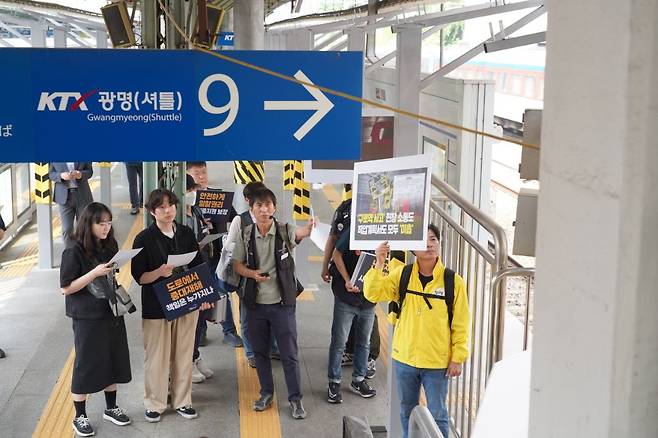 | ▲ 지난 28일 '구의역 스크린도어 사고 9주기-공공교통이 안전한 사회를 위한 다크투어' 중 서울 구로역에서 있었던 '구로역 선로 유지보수 차량 충돌 노동자 사망 추모' 행사. 철도노조에서 직접 가이드를 맡아 중대재해의 사고 원인 및 경과 등을 참가자들에게 설명했다. |