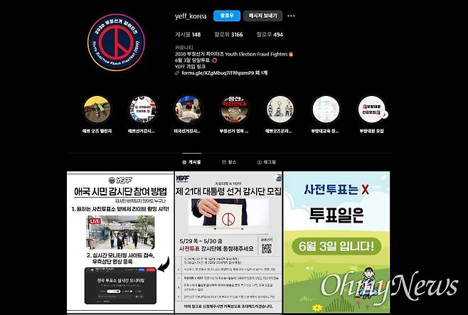 | ▲ 부정선거 음모론을 주장하는 YEFF(Youth Election Fraud Fighters)라는 단체가 인스타그램 계정에 올린 게시물들. 자유대학이란 단체와 함께 '선거 감시단'을 모집하는 게시물도 올라와 있다. |