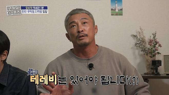 추성훈은 "컴퓨터는 있는데 텔레비전이 없지 않나. 일본 텔레비전 안 보냐"고 물었다. 주우재는 "요즘 텔레비전 없는 집이 많다"라고 말했다. 이에 추성훈은 "나는 텔레비전 시대라 텔레비전이 없으면 불안하다"라며 아쉬워했다. 주우재는 "좀 안쓰러우셨나 보다"라고 했다. 추성훈은 "그런 것도 있고 텔레비전은 있어야 한다. 텔레비전 보면서 배우는 게 많다. 요리 방송도 많이 있다"라고 말했다.