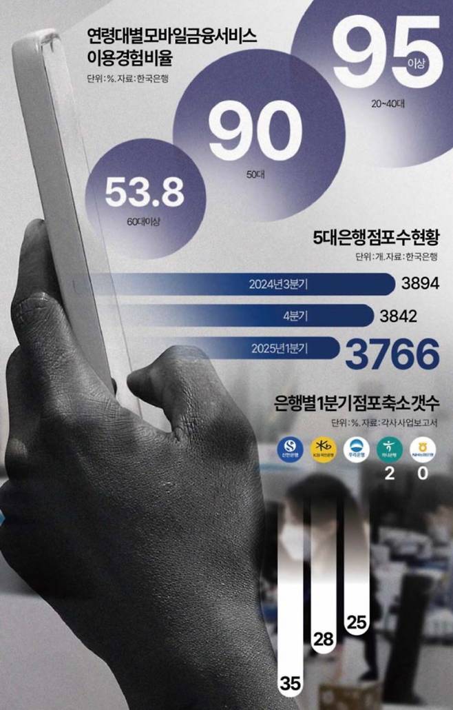 실제로 국민은행과 신한은행은 전체 감축 규모 중 서울 내에서만 지점 20곳을 폐쇄했고, 우리은행은 13곳을 없앴다. 반면 고령층 비중이 높은 지방의 점포 수는 대동소이한 것으로 나타났다.