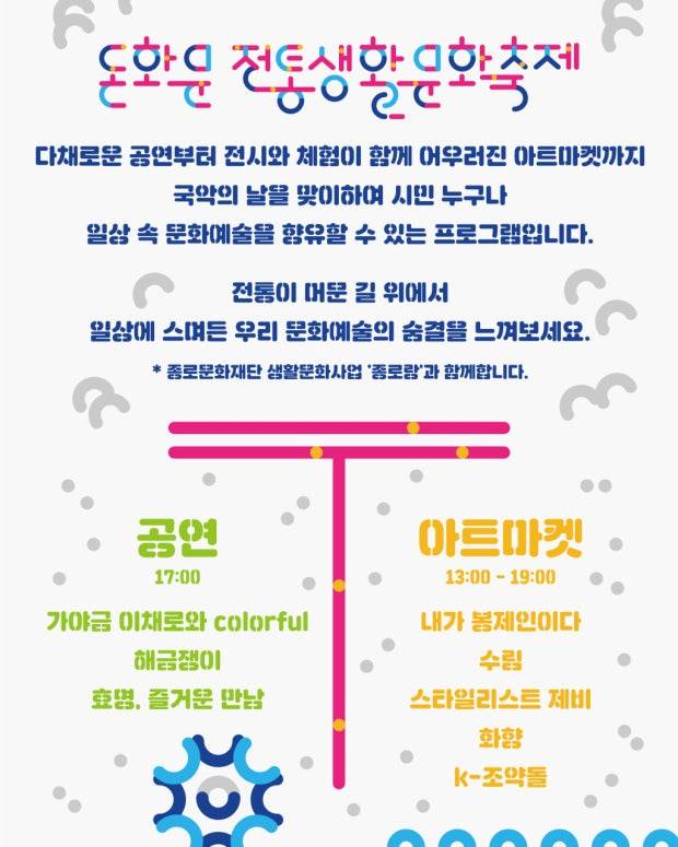 다가오는 6월 7일(토)에는 종로에서 두 개의 축제가 열린다. 돈화문 전통생활문화 축제와 2025 서울국악축제다. 국악의 날(6월5일)을 맞이한 주말에 시민들이 다채로운 공연과 전시체험을 즐길 수 있는 프로그램이다. 돈화문국악당에서 열리는 전통생활문화 축제에서는 오전 10시~오후 7시에 열리는 아트마켓과 오후 5시부터 시작되는 공연을 무료로 관람할 수 있다.
