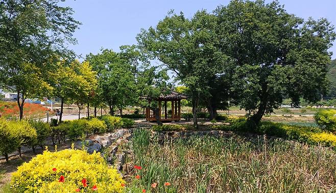 임곡마을회관 앞에 만들어진 마을숲이 조붓하면서도 멋스럽다. 가운데에 작은 연못을 두고 황금사철 등 나무와 꽃이 심어졌다. 빨간 꽃양귀비도 활짝 피었다. 마을숲은 2017년 장성군 지원을 받아 조성했다.