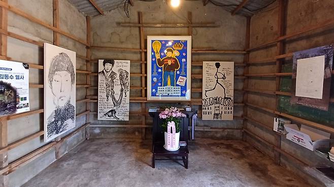 | ▲ 김동수 열사의 얼굴이 그림으로 걸려 있는 김동수기념관. 생가의 창고를 단장해 만들었다. |