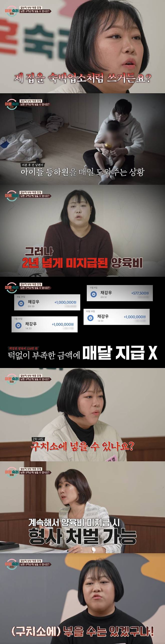 아내는 "못 받은 양육비 계산하면 약 4천4백만 원이다. 아이 아빠가 경제적 능력이 없어 양육비를 못 줘ㅆ으면 구치소에 넣을 수 있냐"고 물었다.