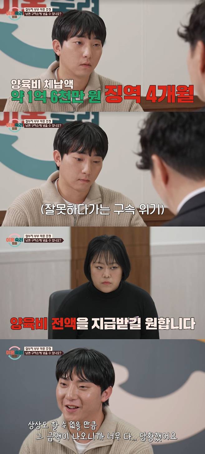 구속 위기 가능성도 생긴 남편은 미지급 양육비가 4천4백만 원이라는 말에 놀라움을 표했다. 전액 지급을 원하는 아내에 남편은 "놀라서 말이 안 나왔다. 상상할 수 없는 금액이 나오니 당황했다"고 고백했다.