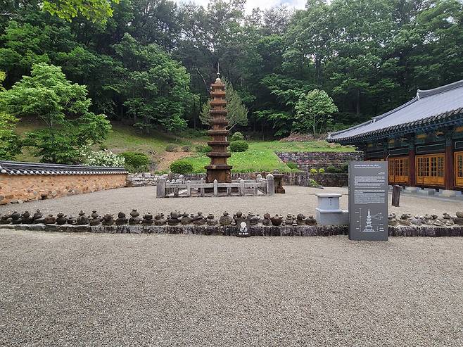 사찰 경내에는 중심 법당인 대웅전을 비롯해 관세음보살을 모신 원통보전, 산신을 모시는 산왕각, 신라 선덕여왕 때 자장율사가 조성한 다층석탑이 등이 차분하게 배치되어 있다. 절은 크지 않지만 전각들이 자연과 조화를 이루며 단정하게 놓여 있어 걷는 내내 마음이 맑아진다.
