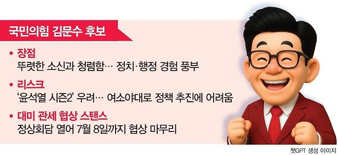 김 후보는 3선 국회의원과 재선 경기도지사 등 오랜 정치 경험을 갖고 있다. 경기도지사 시절 GTX(수도권광역급행철도) 건설과 판교·평택 기업 유치 등 굵직한 사업을 주도해 호평받았다. 김 후보가 대통령이 되면 교통과 산업 분야에서 자신의 경험을 활용할 것으로 보인다.하지만 '김문수 대통령' 뒤에는 '윤석열 정부'의 그림자가 어른거린다는 지적이 나온다. 우선 대통령이 되면 당내 갈등 문제부터 해결해야 한다. '친윤'(친윤석열) 지도부와의 갈등을 가까스로 봉합한 뒤 출범한 선거대책위원회는 각 계파의 물리적 결합을 통해 분열을 막으려 했다. 하지만 이후에도 '완전한 원팀'을 이루지 못했다는 평가를 받았다. 함께 대선 경선에 참가한 한동훈 전 대표와 홍준표 전 시장은 친윤 세력과 절연해야 한다는 입장을 피력했다. 현재 김 후보 선대위는 윤 전 대통령의 최측근으로 불리는 윤상현 의원을 공동선대위원장에 임명하는 등 모호한 태도를 취하고 있다. 김 후보가 대통령에 당선하면 당내 갈등이 다시 수면으로 떠오를 가능성이 크다.