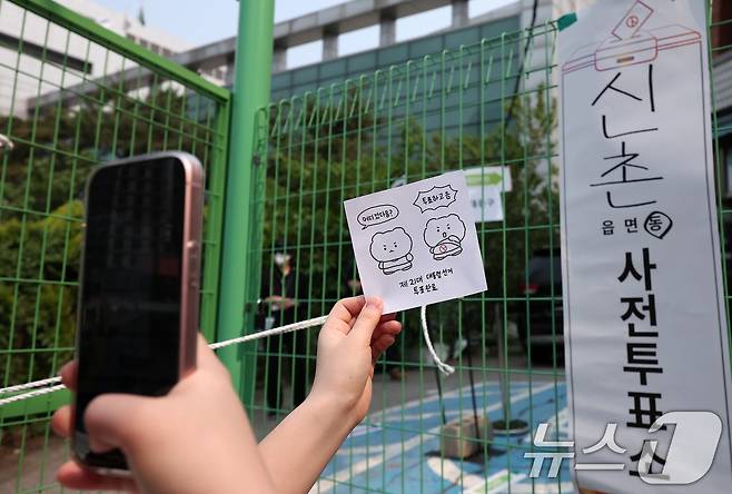 (서울=뉴스1) 김성진 기자 = 제21대 대통령 선거 사전 투표 둘째 날인 30일 오전 서울 서대문구 구 신촌동 주민센터에 마련된 신촌동 사전투표소에서 유권자들이 투표를 마친 후 인증샷을 찍고 있다.