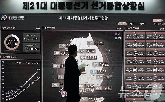 (과천=뉴스1) 오대일 기자 = 제21대 대통령선거 사전투표 둘째 날인 30일 오전 경기도 과천 중앙선거관리위원회 선거종합상황실 대형 전광판에 동시간대 투표율을 비롯한 사전투표율 현황이 표시되고 있다. 2025.5.30/뉴스1