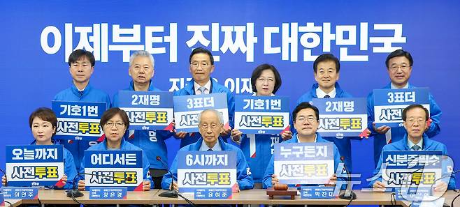 (서울=뉴스1) 안은나 기자 = 30일 서울 여의도 더불어민주당 중앙당사에서 열린 중앙선거대책위원회의에서 참석자들이 제21대 대통령선거 사전투표를 독려하고 있다. 앞줄 왼쪽부터 이언주, 정은경, 윤여준, 박찬대, 이석연 선대위원장. 2025.5.30/뉴스1