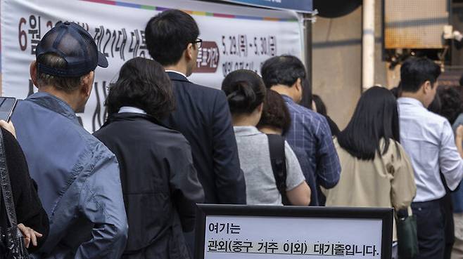 ▲ 사전투표 이틀째인 30일 오전 서울 중구 소공동 주민센터에 마련된 사전투표소가 회사 출근길에 투표하려는 시민들로 붐비고 있다.