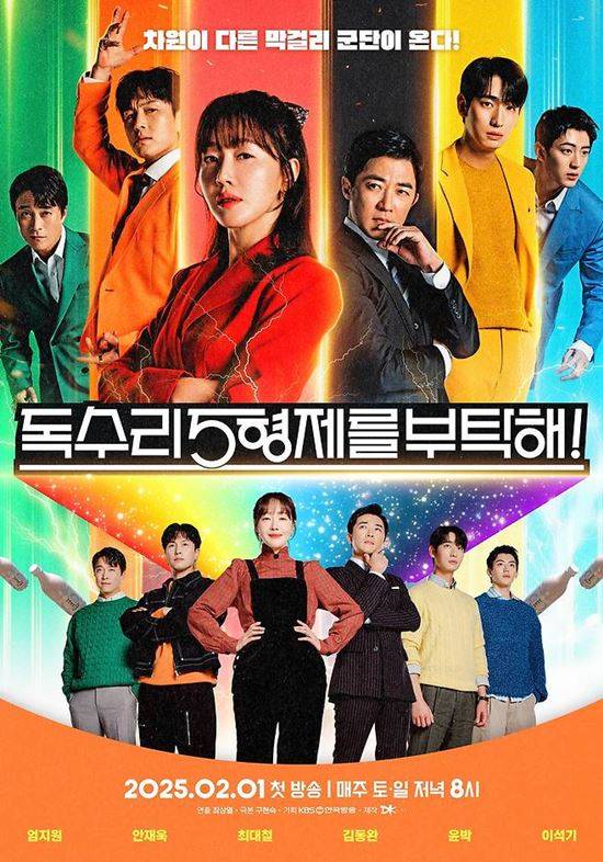 '독수리 5형제를 부탁해!'는 오랜 전통을 이어온 ‘독수리 술도가’의 개성 만점 오형제와 결혼한 지 열흘 만에 남편의 갑작스런 죽음으로 가장이 된 맏형수가 빚어내는 잘 익은 가족 드라마. 배우 엄지원, 안재욱, 최대철, 김동완, 윤박, 이석기, 박준금, 최병모, 배해선, 박효주, 유인영, 윤준원, 신슬기 등이 출연 중이다.
