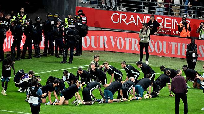 ▲ 프랑스 프로축구 1부 복귀가 확정된 후 세리머니 하는 메스 선수들