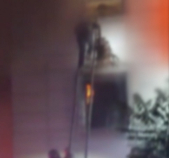 구조 사다리에 몸을 맡긴 투숙객 한 명이 간신히 창밖으로 탈출합니다.