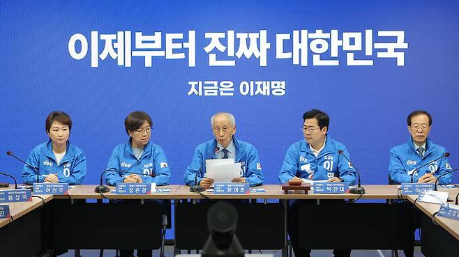 ▲ 더불어민주당 윤여준 상임총괄선거대책위원장이 30일 서울 여의도 더불어민주당 중앙당사에서 열린 중앙선거대책위원회의에서 발언하고 있다.