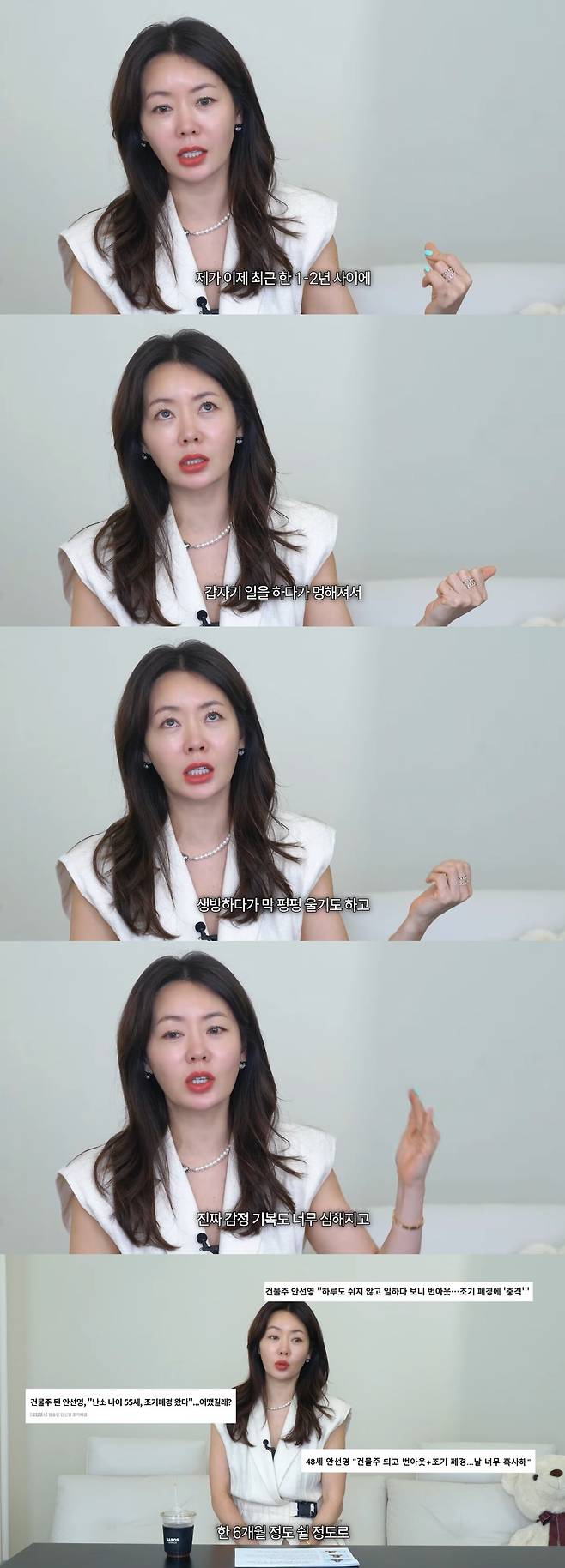 이어 건물주가 된 후에는 행복 대신 바쁜 일상으로 인한 번아웃 증후군과 조기폐경 진단을 받았음을 고백해 화제된 바 있다.