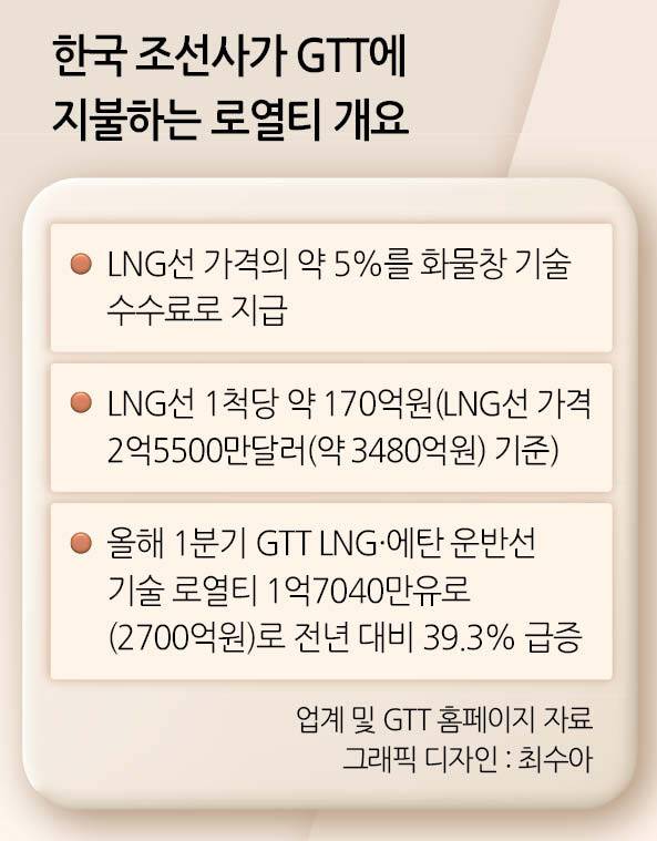 지난달 기준 세계 조선시장에서 새로 건조되는 LNG선 한 척의 가격은 2억5500만달러(약 3480억원)에 달한다. LNG선을 건조할 때마다 GTT에 돌아가는 화물창 기술료는 약 5% 수준이다. 단순 계산 시, 국내 조선사들은 LNG선을 건조할 때마다 GTT에 170억원 이상의 로열티를 지불하는 것으로 추정된다.