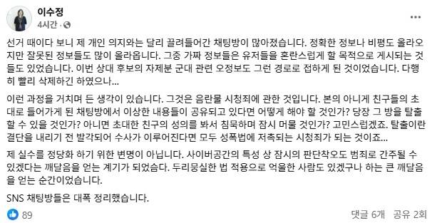 | ▲ 이수정 국민의힘 경기수원정 당협위원장이 페이스북에 올린 가짜뉴스 관련 해명글 |