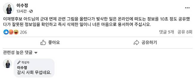 | ▲ 이수정 국민의힘 경기수원정 당협위원장이 페이스북에 올린 가짜뉴스 관련 해명글. 첫 번째 댓글에 "감시 사회 무섭네요"라고 달았다. |