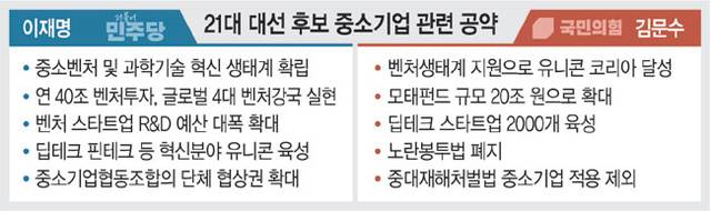 김 후보에 대해서는 “사회적 책임을 외면했다”는 지적도 나온다. 중기업계 관계자는 “노동자 권리 보호와 산업재해 예방 등 사회적 책임 측면에서의 균형 있는 접근이 부족하다”고 지적했다. 오동윤 동아대 경제학과 교수(전 중소벤처기업연구원장)는 “두 후보 모두 정보기술(IT) 산업 이후 ‘벤처 2.0’ 시대를 이끌 우두머리 산업이 뭔지에 대한 고민이 빠져 있고 돈만 퍼붓겠다는 것”이라고 비판했다.