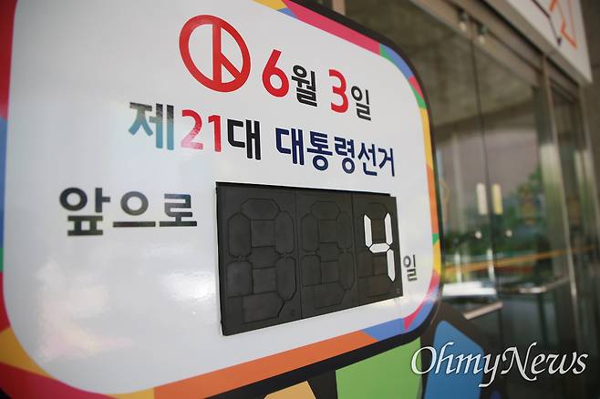 | ▲ 21대 대통령선거 사전투표가 이어지는 가운데 부산시선거관리위원회에 본투표 D-4일 안내가 붙어있다. |
