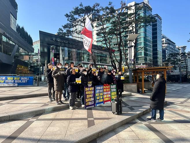 | ▲ 자료사진. 알티베이스지회가 지난해 12월 임금 동결을 주장하는 회사에 항의하며 집회를 진행하고 있다. |