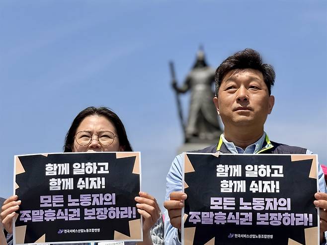 | ▲ 모든 노동자의 주말휴식권 보장 서비스연맹은 주말에도 일하는 노동자들의 건강권, 일·삶의 균형을 위해 “다들 쉴 때 같이, 규칙적인, 지속되는” 주말휴식권을 보장을 요구하고 있다. |