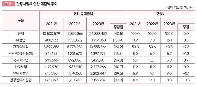 | ▲ 관광매출액 연간 추이 출처_ 문화관광연구원의 한국관광정책 2025년 봄호_‘2023년 기준 관광산업 동향 분석’ 중 |