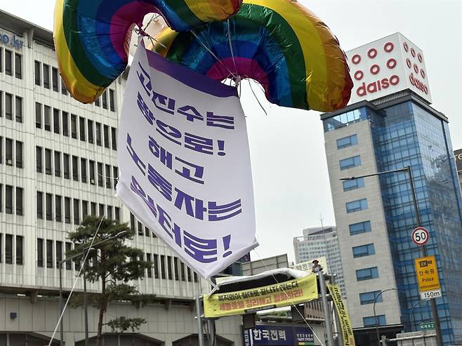 세종호텔에서 조리사로 일했던 고진수씨. 그는 5월 30일 고공농성 107일을 맞았다. 명동 세종호텔 앞 10미터 높이 교통시설 구조물에서 눈과 비, 바람을 고스란히 맞으며 지낸다. 세종호텔은 2021년 12월 10일 코로나19로 경영이 악화됐다는 이유로 정리해고를 단행했다. 당시 식음료사업부를 폐지하고 조직을 개편하면서 대부분 식음료사업부 소속이던 조합원들을 해고했다. 사측 입장에선 코로나19를 빌미로 사업 외주화와 껄끄러운 관계였던 세종호텔지부의 와해, 둘 다 이룬 셈이다. 세종호텔 해고노동자들은 부당한 정리해고에 맞서 일터로 돌아가기 위해 1269일째 싸우고 있다. 호텔에서 일하면서 가족과 함께하는 일상의 삶을 되찾기 위해, 노조 활동을 보장받기 위해 싸우고 있다.