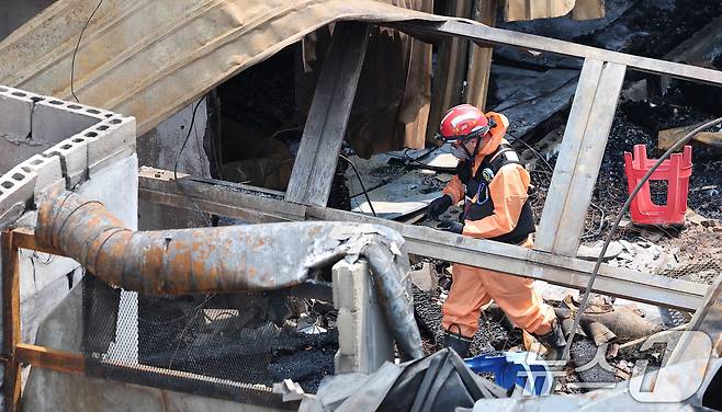 (서울=뉴스1) 김성진 기자 = 30일 경찰·소방·한국가스공사 등 관계자들이 서울 을지로 세운상가 인근 화재 현장에서 합동감식을 하고 있다.