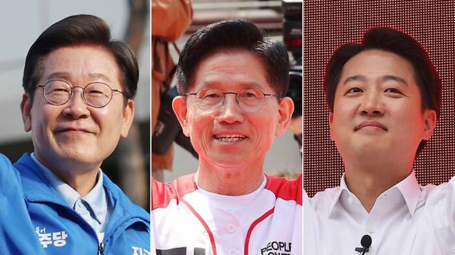 ▲ 26일 남양주 유세 나선 이재명 후보(왼쪽부터), 평택 K-55미군기지 정문 앞에서 유세하는 김문수 후보, 24일 수원역 로데오거리에서 유세하는 이준석 후보