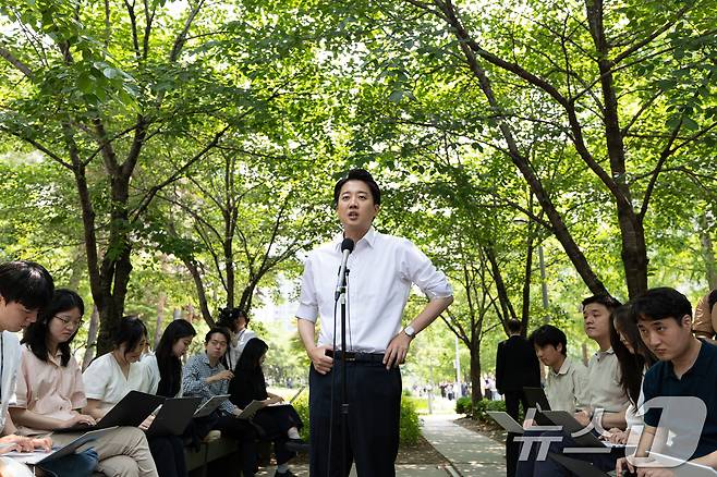(서울=뉴스1) 이승배 기자 = 이준석 개혁신당 대통령 후보가 제21대 대통령선거 사전투표 둘째 날인 30일 오후 서울 마포구 경의선숲길에서 유세에 앞서 언론 브리핑을 하고 있다. 2025.5.30/뉴스1