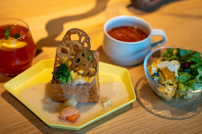 OMO5구마모토의 조식이 특별한 점은 바로 구마모토 향토 요리에서 영감을 받은 메뉴가 있다는 것. 속에 겨자가 채워진 연근 요리인 카라시렌콘(からしれんこん)에서 영감을 받은 연근 큐브 토스트가 그 주인공이다. 따끈한 화이트 스튜에 톡 쏘는 겨자의 매운맛과 얇고 바삭한 연근 튀김, 살강살강 씹히는 채소가 어우러져 있다.