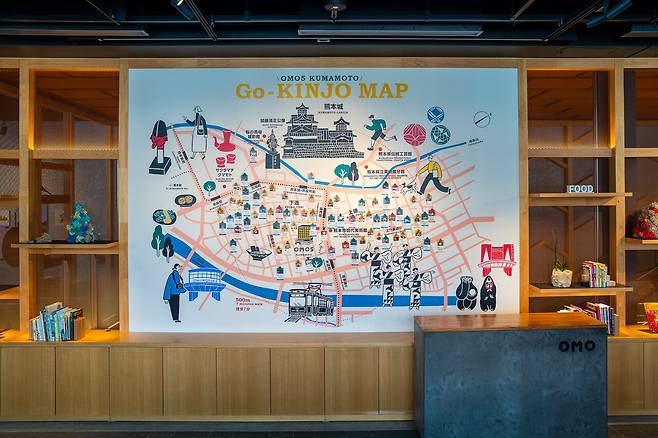 OMO5 구마모토는 여행자들이 구마모토에 흠뻑 빠질 수 있도록 다양한 프로그램과 소품을 준비해 뒀다. 벽면에 커다랗게 자리 잡은 고 킨죠 지도(Go-KINJO MAP)는 호텔 주위 500m(도보 7분 이내의 거리)에 있는 맛집, 여행지, 카페, 바 중에서 현지 전문가 스태프인 OMO레인저들이 직접 가 보고 엄선한 곳만 담았다.